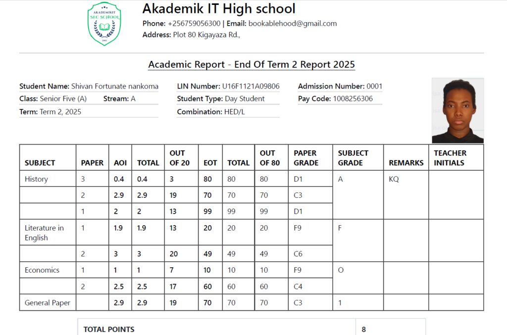 Automatically generate detailed report cards aligned with Uganda’s standard competence-based curriculum, including O and A level curricula. Our system evaluates students’ competencies, projects and Generic skills based on UNEB grading standards, ensuring transparency and consistency.